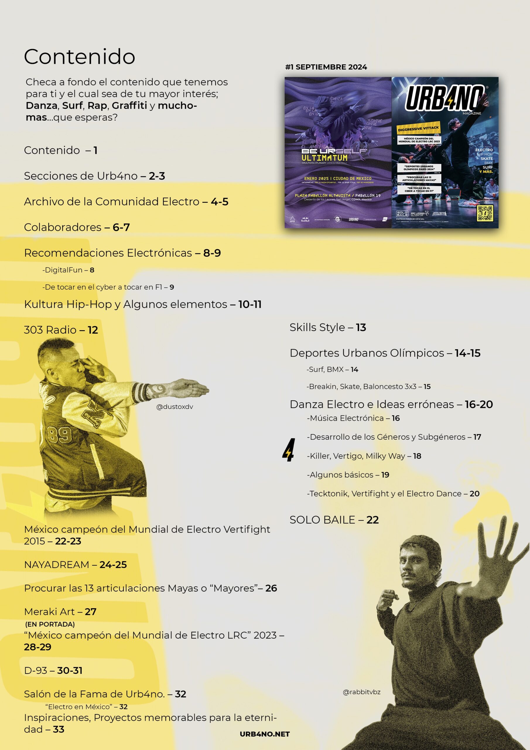 | Contenido | Secciones de Urb4no, Personajes destacables del Archivo de la Comunidad Electro, Kultura Hip Hop, Deportes Urb4nos Olímpicos, Danza Electro y Errores Comunes, México Campeón Mundial de Electro Dance 2015 y 2023, Salón de la Fama de Urb4no. |